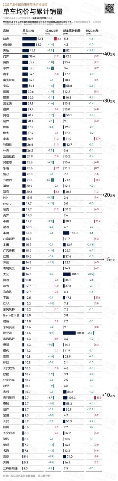 近日,杰兰路发布《2025年乘用车品牌单车成交均价与销售额报告》,报告显示,2025年问界单车成交均价达38.6万元,位列新势力品牌成交均价第一名;同时,全年累计销量超42万辆。成交均价与销量连续两年实现增长,形成“量价双升”昂扬曲线,反映出问界“智慧重塑豪华”的品牌理念与长期价值已获得市场广泛认可。