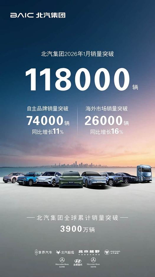 近日,北汽集团发布1月销量快报,其总销量稳达11.8万辆,新能源汽车销量8073辆,同比分别增长11.83%,自主品牌销量则7.4万辆,同比增长11%,占比升至62.7%;海外销量2.6万辆,同比激增16%,远超行业平均。在车市承压、新能源政策换挡的双重考验下,北汽在逆势之下实现技术、产品与体系的多重突破,如此亮眼的表现也值得行业关注。