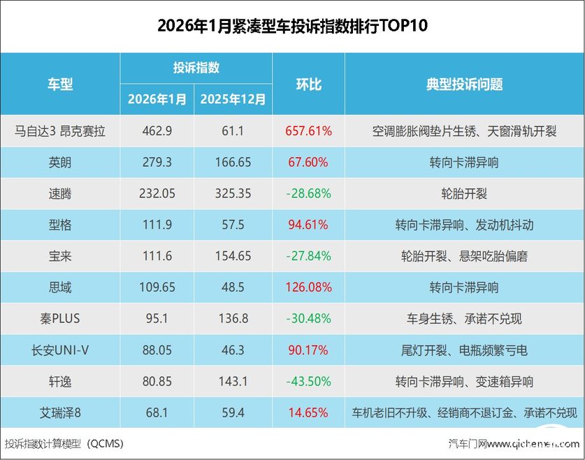 2026年1月紧凑型车投诉指数排行:生锈将它推上榜首