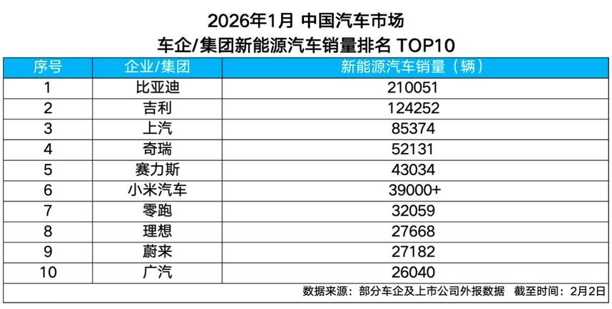 新年伊始,中国新能源汽车市场的竞争轮廓迅速显现,头部车企之间的差距在1月销量榜单中被进一步拉开。截至2月2日,根据部分车企及上市公司对外披露的数据,比亚迪以超21万辆的新能源汽车销量位居行业首位,展现出极具强大的市场竞争力,继续稳居中国新能源市场头部位置,并在主要车企中拉开明显差距。