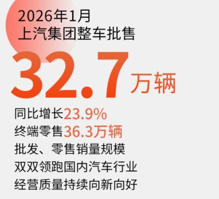 上汽集团披露今年1月的数据显示,集团实现整车批售32.7万辆稳居榜首,同比增长23.9%,终端零售36.3万辆。其中,自主品牌销量攀升、新能源汽车销量的稳定增长以及海外市场的持续发力,是上汽集团今年1月市场表现的主要看点。