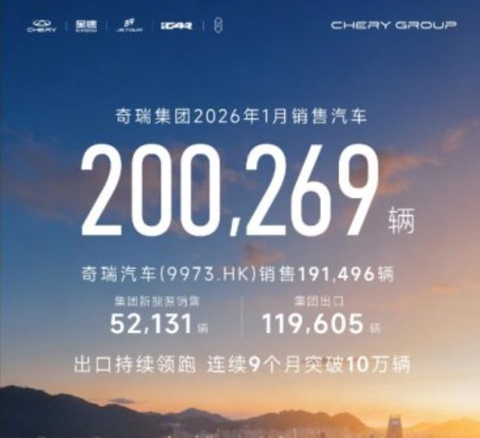 奇瑞集团一月销量共计为200269辆,同比下滑10.72%,环比下降18.23%;新能源汽车销量为52131辆;出口汽车销量为119605辆,同比增长48.1%,依然是目前自主品牌出口销量的头把交椅。其中的奇瑞汽车股份有限公司销量为191496辆;奇瑞品牌销量为135551辆,星途品牌销量为5276辆,捷途品牌销量为42744辆,iCAR品牌销量为3419辆。