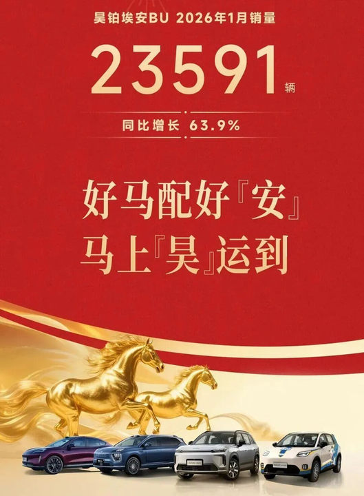 广汽集团的昊铂埃安1月销量23591辆,同比增长63.9%;广汽传祺1月份全系销量为26937辆,环比增长25.07%,同比增长2.06%。