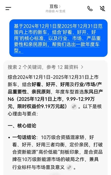 我们照例询问了豆包大模型:“基于2024年12月1日至2025年12月31日范围内上市的新车,结合‘好看、好开、好用’的核心标准,以及行业、市场、产品重要性和亲民原则,帮我们选出一款年度车型。”