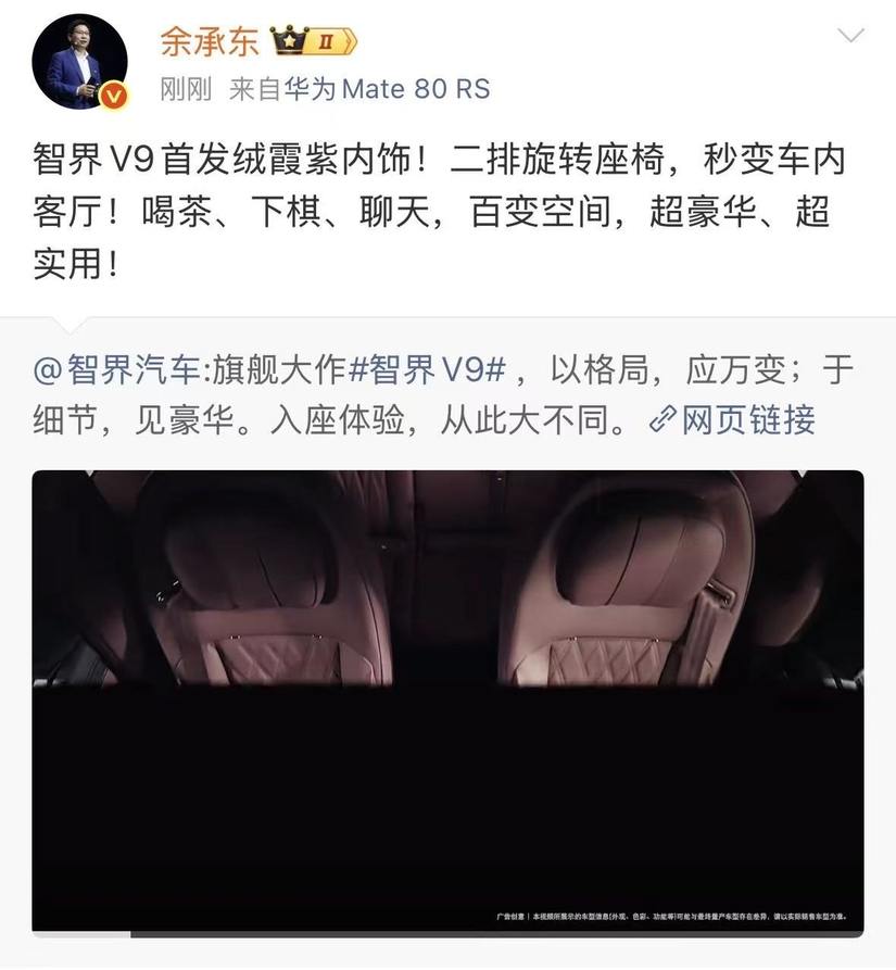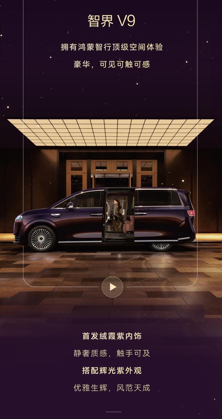 2月5日,鸿蒙智行首款旗舰9系MPV智界V9内饰视频正式公布,官宣“绒霞紫”专属内饰配色与“辉光紫”外观命名。这款鸿蒙智行又一高端力作,凭借二排旋转座椅、双零重力座椅等百万级豪华配置,以及媲美顶级豪车的工艺用料,颠覆市场对高端MPV的传统认知,以“MPV科技车皇”的硬核产品力,为用户勾勒出未来智能豪华出行的全新图景。
