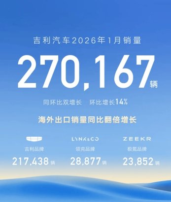 吉利汽车的“开门红”含金量十足,1月销量达270167辆,同比增长1%,环比增长14%,成为市场中鲜有的环比和同比均实现增长的车企,展现出极高含金量的开门红。并且,出口销量达60,506辆,同比大增121%。