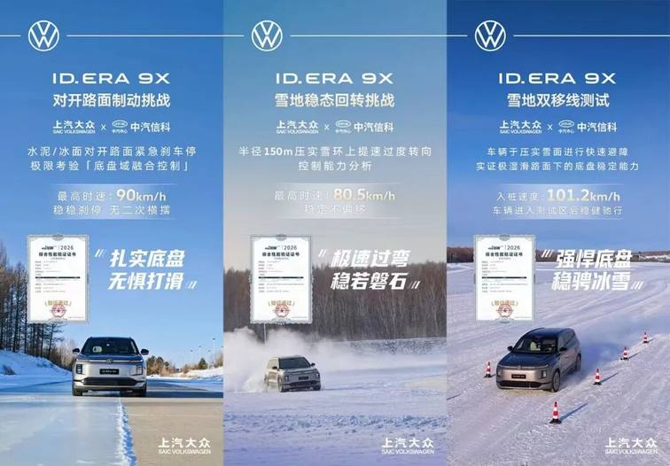 《早懂车》了解到,上汽大众2026年共计将有7款全新新能源车型陆续推出,全面覆盖纯电、插混、增程三大技术路线。AUDI品牌第二款车型奥迪E7X将于北京车展正式亮相。ID. ERA的首发力作ID.ERA 9X量产在即,将迎来首车下线。近期,ID. ERA 9X在黑河完成冬季测试,成功通过对开路面制动、雪地稳态回转、雪地高速爆胎等综合性能验证。极限考场不仅检验出“黄金增程系统”解决行业痛点的硬核底气,也显示出"在中国 为中国”战略下更出众的研发与技术实力。