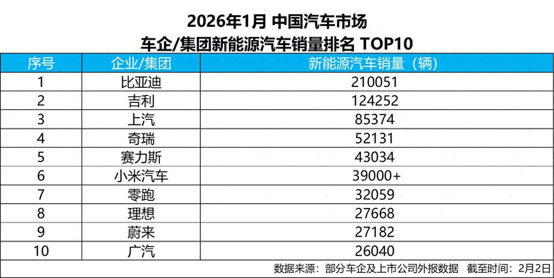 新年伊始,中国新能源汽车市场的竞争轮廓迅速显现,头部车企之间的差距在1月销量榜单中被进一步拉开,分化格局愈发显现。截至2月2日,根据部分车企及上市公司对外披露的数据,比亚迪以超21万辆的新能源汽车销量位居行业首位,继续稳居中国新能源市场头部位置,并在主要车企中拉开明显差距。