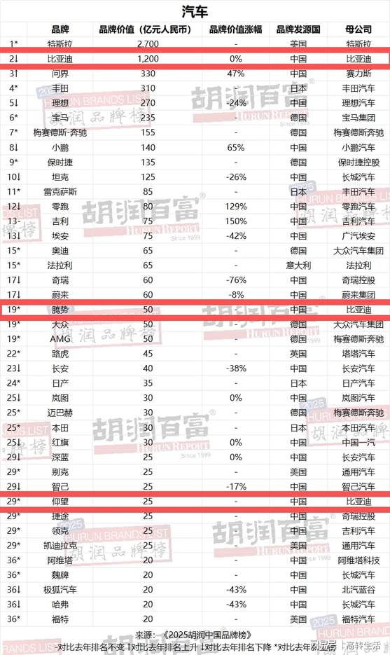 2月3日,规则调整后的2025胡润汽车品牌榜出炉。榜单显示,比亚迪以1200亿元品牌价值连续四年蝉联中国汽车品牌第一名。