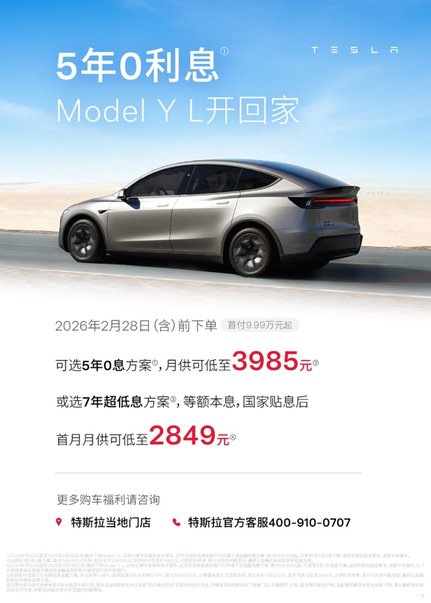 多重福利加码,解锁购车好时机即日起至2026年2月28日,下单Model 3全系享8000元限时保险补贴,直接抵扣尾款;金融方案灵活选,5年0息或7年超低息(年费率低至0.5%,Model Y L首次开放5年0息政策),首付门槛大幅降低;Model Y全系可通过特斯拉车主引荐享8000元车漆选装礼金,现车订购优先提车。