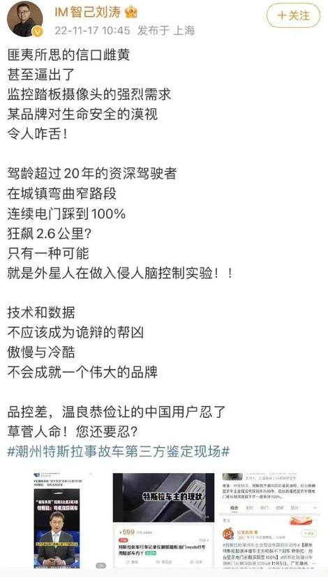 2022年11月广东潮州发生特斯拉交通事故致2死3伤,刘涛曾发微博质疑特斯拉“刹车失灵”“漠视安全”,称“技术和数据成诡辩帮凶”。