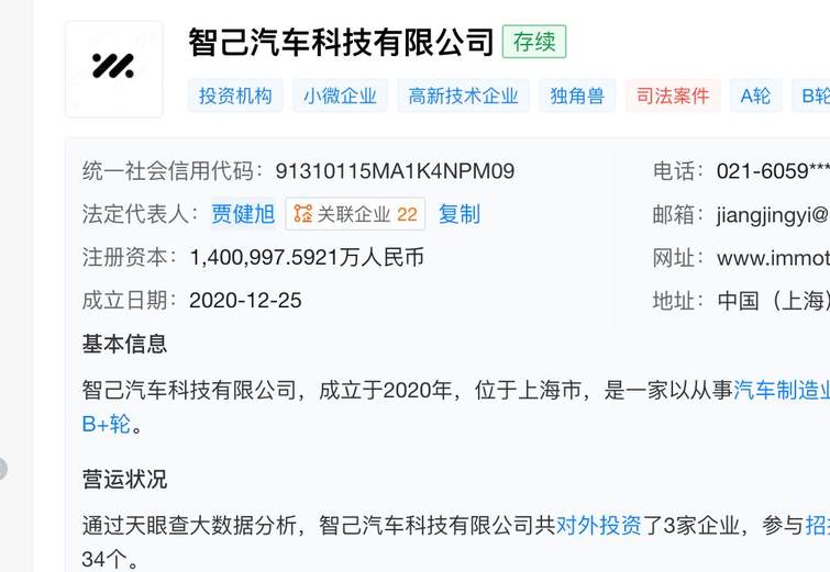 根据天眼查App显示,汽车成立于2020年,背后有着上汽、张江高科、阿里巴巴三家联手打造的高端汽车公司,对标得是蔚来、理想这种品牌。