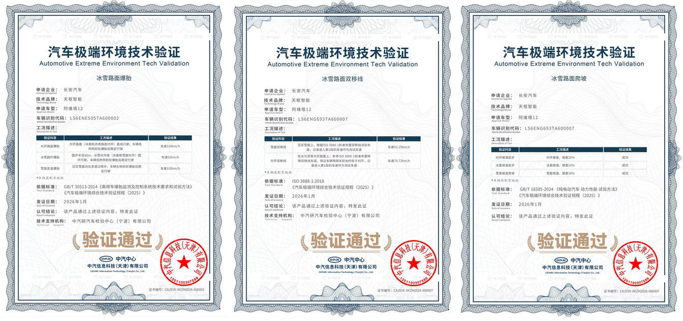 测试结束后,新阿维塔12获得了中汽中心颁发的《汽车极端环境技术验证-冰雪路面爆胎》《汽车极端环境技术验证-冰雪路面双移线》《汽车极端环境技术验证-冰雪路面爬坡》三项证书。证书显示,新阿维塔12以100km/h车速,通过雪面变道爆胎测试;以100km/h车速,通过冰面/沥青路面的对开路面爆胎测试;以92.29km/h车速,通过雪面双移线测试;以70.72km/h车速,通过冰面/沥青路面对开双移线测试。面对冰雪挑战,新阿维塔12用一项项硬核数据,印证极端环境下的安全性能。