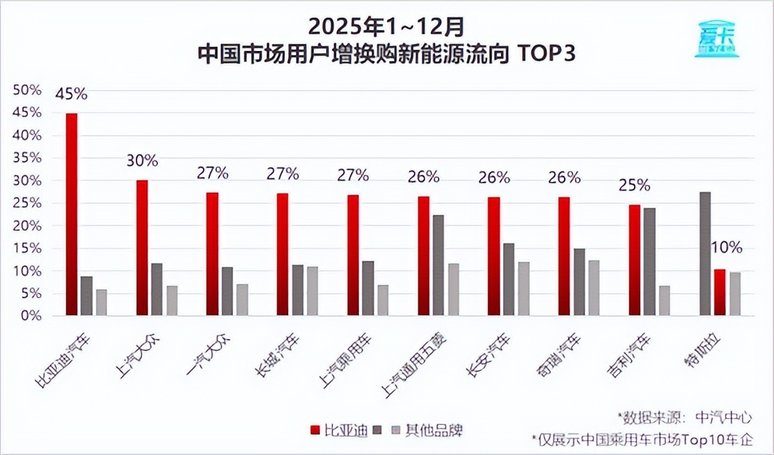 更关键的是,比亚迪在新能源增换购市场形成强大“虹吸效应”,无论是比亚迪自身老车主,还是主流合资、自主品牌车企用户,在置换新能源车型时,均将比亚迪列为首选品牌。在国内乘用车市场TOP 10车企用户中,平均每4个增换购新能源的用户里,就有1个投向了比亚迪,这一数据不仅佐证了比亚迪在新能源增换购市场的统治力,更彰显其作为置换新能源核心品牌的实力。