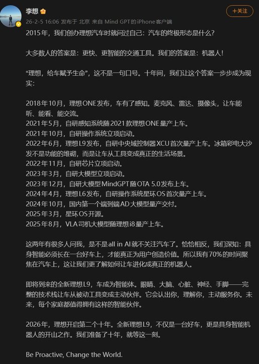 简单来说,理想不是赶时髦,而是“车=机器人”这个十年前的判断,恰好赶上了AI Agent爆发的风口。
