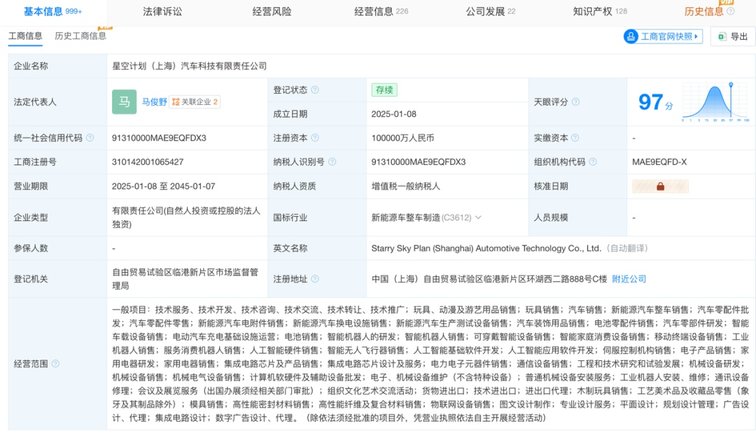 此外,星空计划(上海)汽车科技有限责任公司在2025年12月短短一天内便全资成立了元一寰宇(上海)科技有限公司、上海星径千跃科技有限公司等7家子公司,后续又在上海宝山区、浙江嘉兴市新增多家关联公司,累计造车相关子公司达10余家,阵仗铺得相当之大。