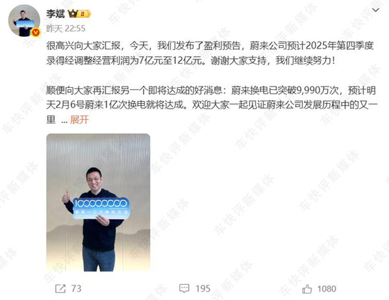 就在2月5日蔚来汽车董事长李斌在社交平台发文,称很高兴向大家汇报蔚来汽车发布了盈利预告,预计2025年第四季度经营净利润为7亿元至12亿元。与此同时李斌还带来了另外一个足以让蔚来汽车骄傲的消息,那就是“死磕”换电的蔚来汽车2月6日将会正式达成1亿次换电。