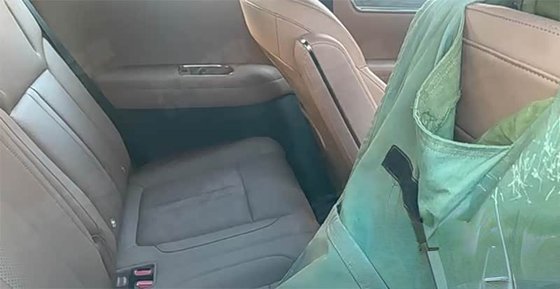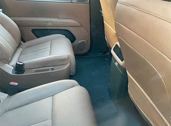 接着来看二排,可以看到二排是两个独立座椅,结合已知消息看,新车是一台2+2+2的6座布局车型。从图中可以看到,二排应该配备了腿托,岛台后部看形状应该会配备车载冰箱。
