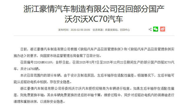 日前,国家市场监督管理总局披露的新一批召回信息,其中显示浙江豪情汽车制造有限公司向国家市场监督管理总局备案了召回计划。召回编号S2026M0016V:自即日起,召回2025年5月7日至2025年12月22日期间生产的部分国产四驱XC70汽车,共计14768辆。