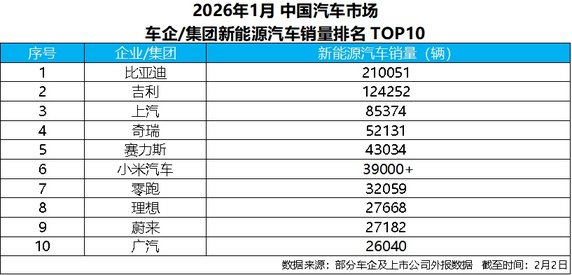 新年伊始,中国新能源汽车市场的竞争轮廓迅速显现,头部车企之间的差距在1月销量榜单中被进一步拉开。截至2月2日,根据部分车企及上市公司对外披露的数据,比亚迪以超21万辆的新能源汽车销量位居行业首位,展现出极具强大的市场竞争力,继续稳居中国新能源市场头部位置,并在主要车企中拉开明显差距。