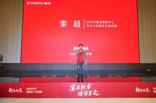 EXEED星途营销中心东北大区黑吉区域经理索超在致辞中表示:“星途品牌的每一步成长,都离不开在座每一位家人的支持与信任。今晚,我们不仅是一场宴会,更是一次家人的团聚,一次心灵的交流。”
