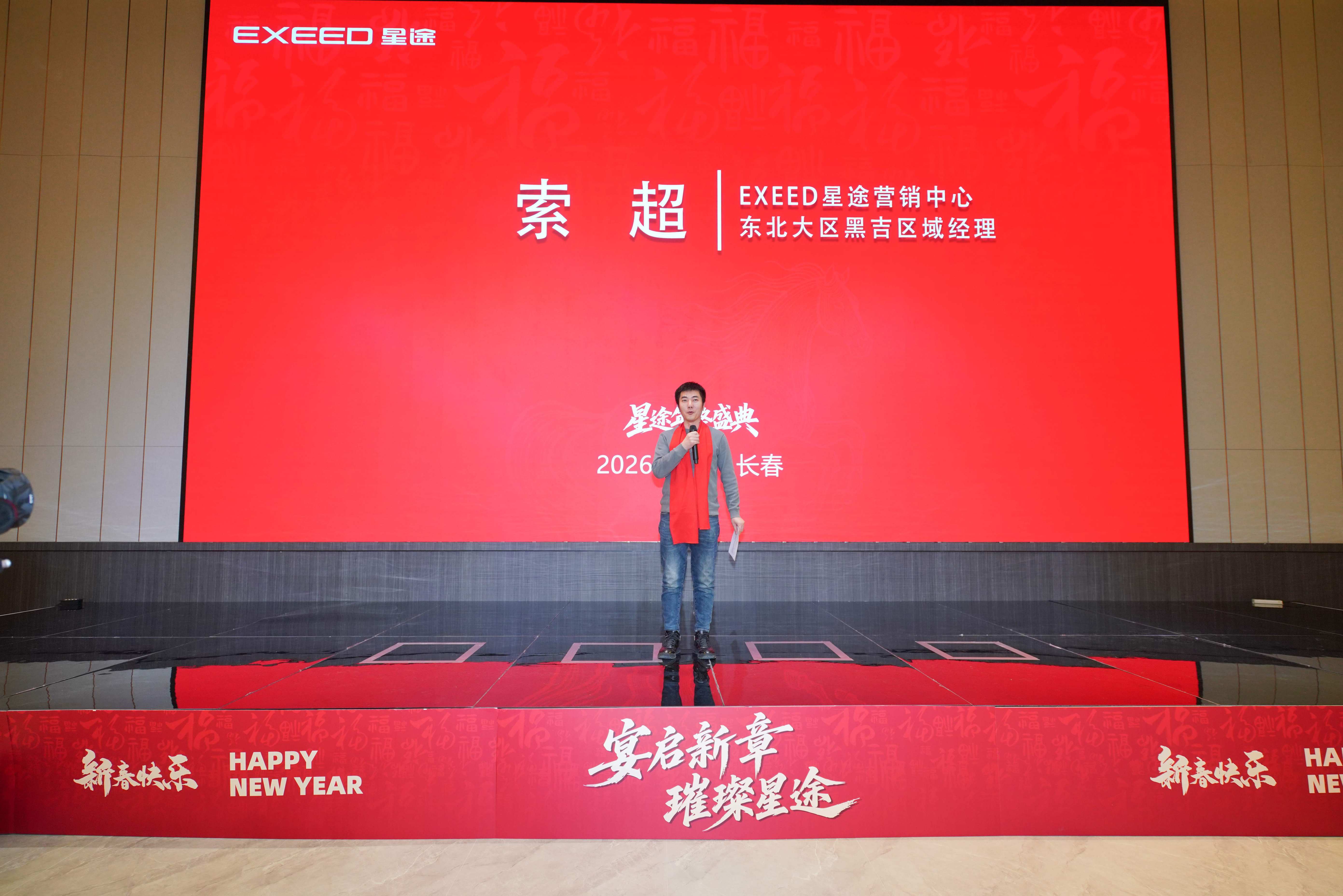 EXEED星途营销中心东北大区黑吉区域经理索超在致辞中表示:“星途品牌的每一步成长,都离不开在座每一位家人的支持与信任。今晚,我们不仅是一场宴会,更是一次家人的团聚,一次心灵的交流。”