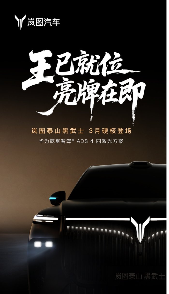 2月9日,岚图汽车官方社交平台发布视频,正式宣布岚图泰山黑武士版将于今年3月登场,采用限定发售策略。