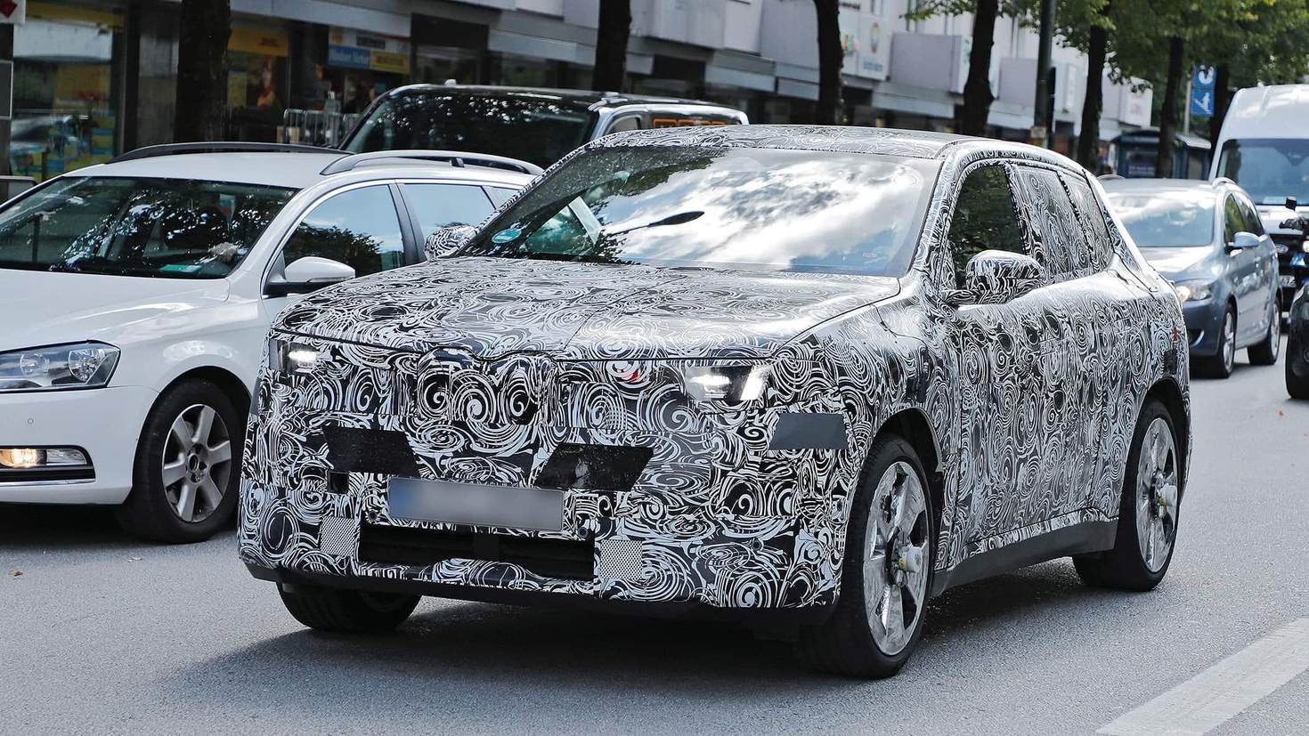 先来看新的iX1。从伪装车照片来看,新一代车型(代号NB5)如预期般在外观上与更大的iX3非常接近,但体型自然更加紧凑。可以看到前后更短的悬垂、稍微更低的车身,以及更内敛的轮拱造型。诸如隐藏式门把手和位于窗框三角区的外后视镜等元素,iX1直接继承了iX3的设计。