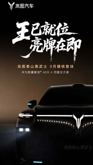 岚图泰山黑武士版3月亮相 搭载华为乾崑智驾4激光雷达
