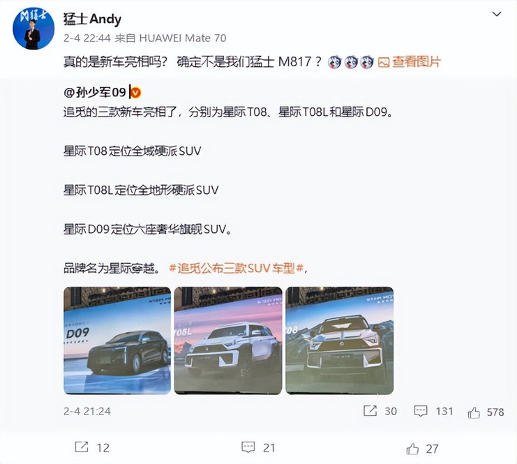 猛士这边的反应也是干脆利落,高管赵安直接在社交平台开怼,一句“真的是新车亮相吗?确定不是我们猛士M817?”配上“买正品认准东风猛士M817”的图,直接把“高仿”的标签钉在了追觅新车上。隔天又发了“请尊重原创”的海报,东风汽车官微也紧跟节奏喊出“真猛士无法被复制”。硬气的表态背后,是对原创设计的捍卫,更是对这种近乎照搬的造车方式的不屑。反观追觅,从2月4日发布会到8日,面对满屏的抄袭质疑,愣是没有一个官方声明,只让相关人士出来打太极,说星际穿越是追觅基金孵化的品牌,跟追觅没股权关系,用合作代工模式撇清关系,这波操作,属实显得心虚。