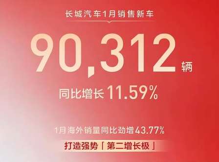 长城汽车1月份共售出9万辆,1月长城汽车总销量90,312辆,同比增长11.6%,环比下降27.2%。其中,海外销售40,278台,新能源车销售18,029台。