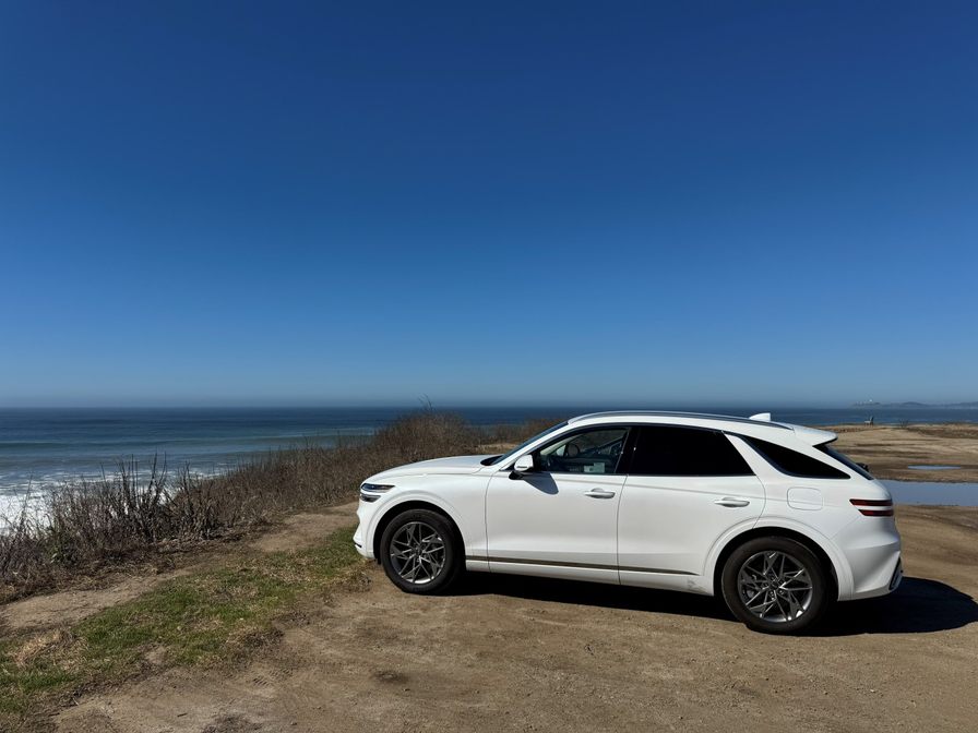 出发第一站先与太平洋合影打卡,GV70的外形还是流畅高级的,即使是低配的轮毂等细节也并不显得廉价。随车文件并没有展示具体的配置单,但我认为它应该就是2.5排量4缸300马力的动力,驾驶体感也基本符合这个参数。