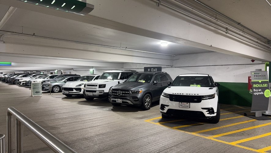 但最终由于能指定的车组都不算理想(牧马人长途太累,Grand Wagoneer进城开着费劲且Valet要加钱,两个车都很费油),且反正要抽盲盒,我决定玩个大的,直接用National的大盲盒抽奖。这家公司的一大特色是,只要注册了会员,就可以在预订中型车组(相当于凯美瑞级别)的时候,在取车地点的几排停车位任选车辆。