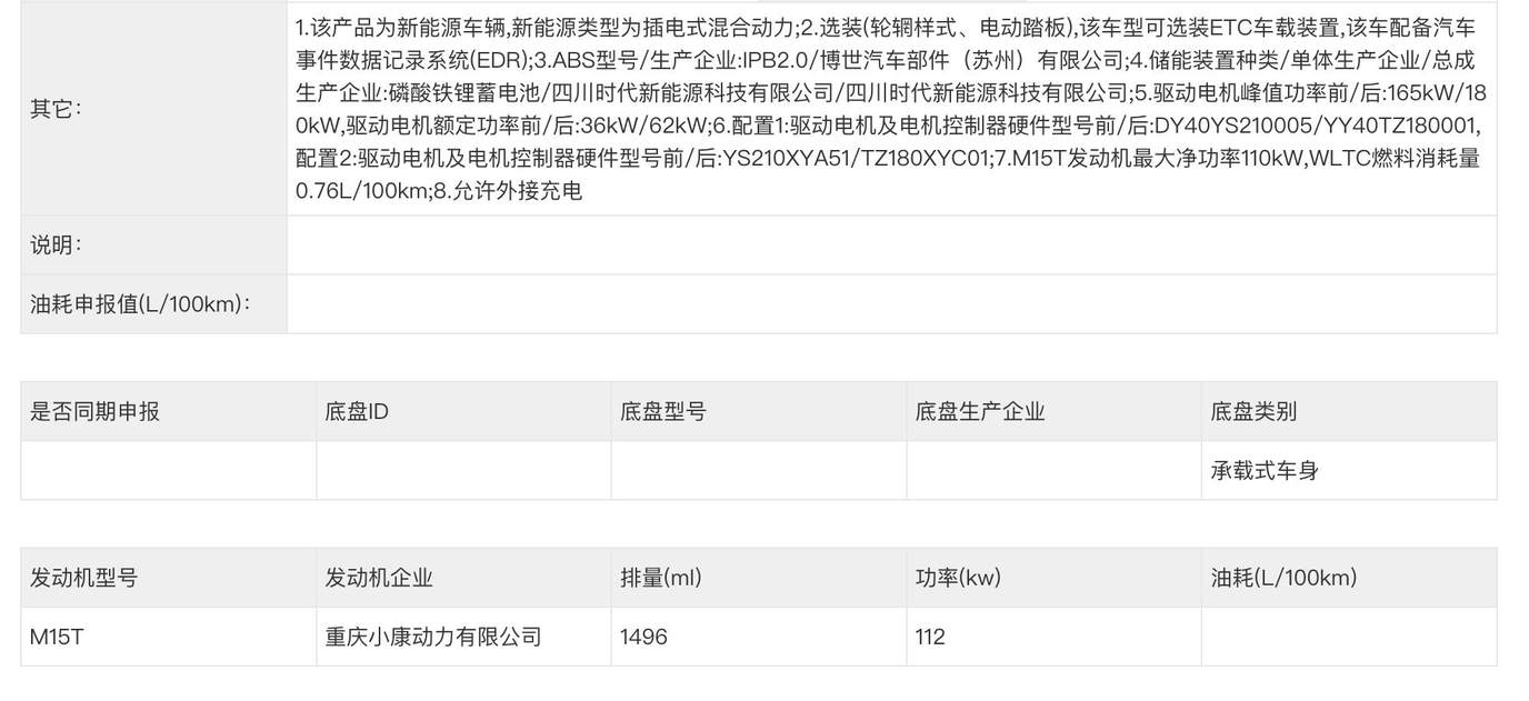 增程版本则搭载全新M15T发动机,与此前M7/M8上的HG15T发动机应该有所区别,输出功率也降低为112kW,具体技术差异尚未公布。这次增程版也是全系四驱,搭载前165kW/后180kW双电机,预计就是用双电机性能来平衡和纯电的定价差异。增程版申报了36度电和52度电的磷酸铁锂电池,供应商依然是宁德时代,WLTC纯电续航里程为180-272公里不等,亏电油耗为5.9-6.1L/百公里。