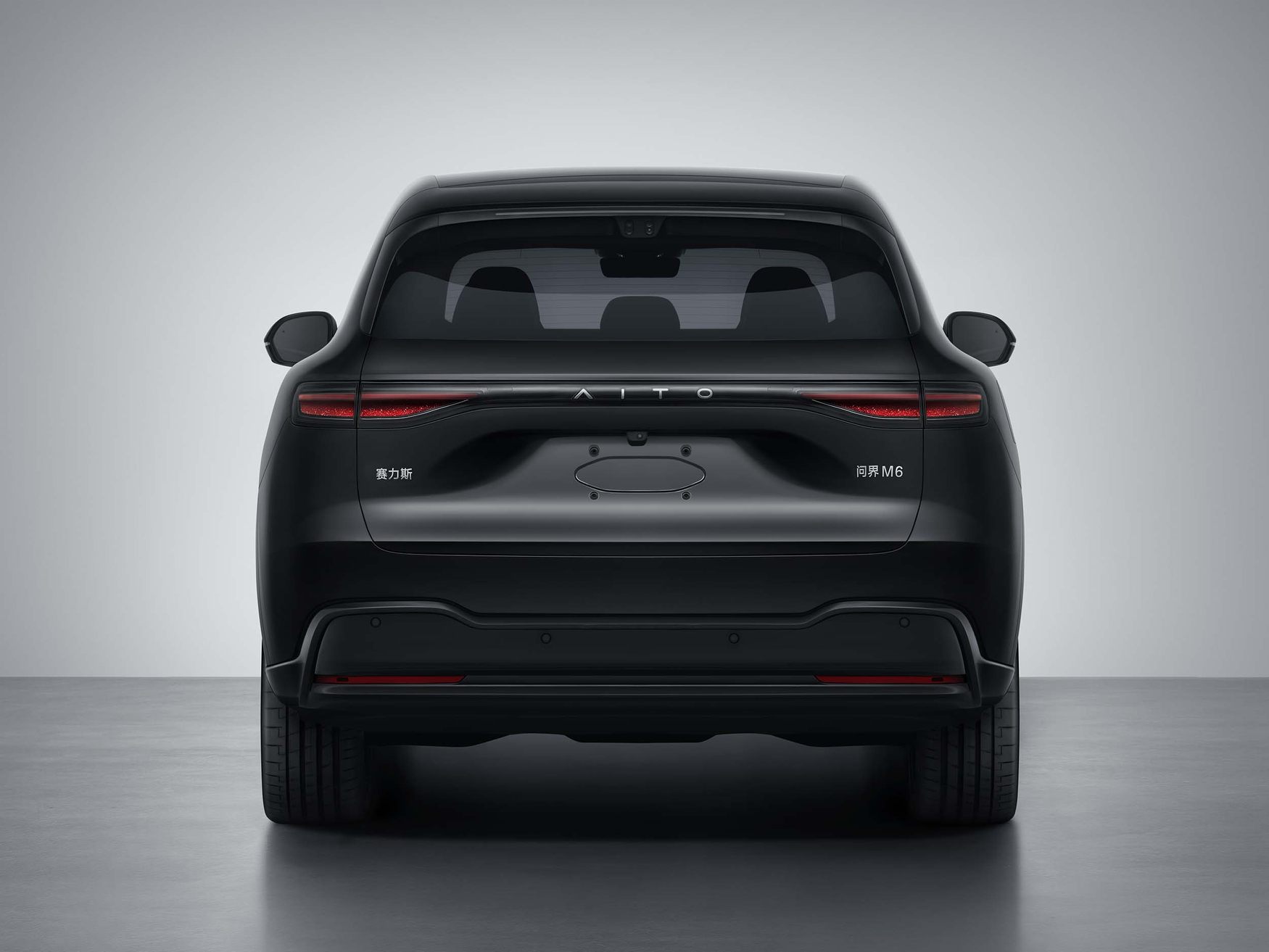 车尾同样非常运动,采用贯穿式灯组,中间采用黑色饰条,内部一圈饰条也是熏黑设计,AITO字母外圈可以点亮。