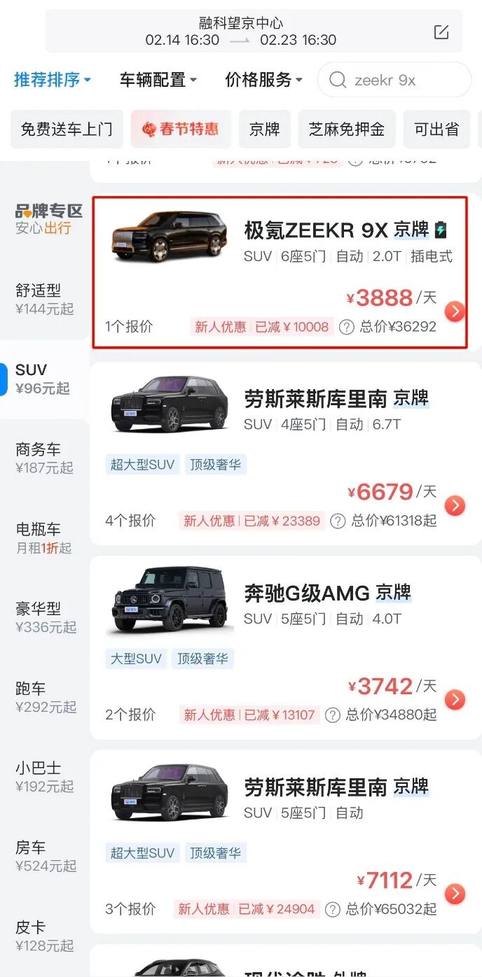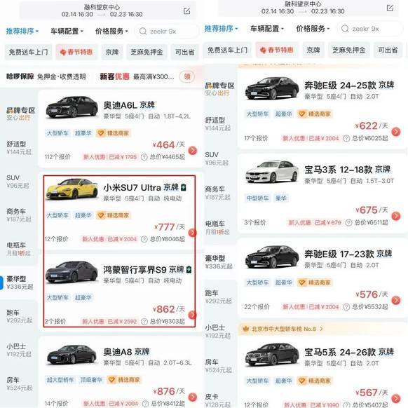 综合多个租车平台的报价来看,在2月14日到2月23日共9天的周期内,集中占据价格高位的国产高端新能源品牌大概有几个派别。