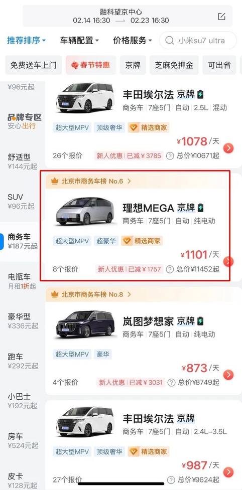 拿今年租车市场来说,极氪009和理想MEGA便力压丰田埃尔法、威尔法,前者单日报价均在1100元以上,后者则在千元档左右,或者低于千元。而像岚图梦想家、腾势D9这样偏高端的车型,早就与别克GL8、格瑞维亚平起平坐了。