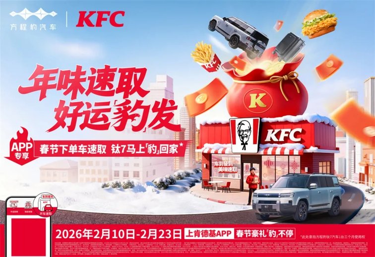 马年新春将至,年味渐浓,比亚迪旗下个性化品牌方程豹与肯德基正式达成跨界合作,于2月10日至2月23日期间,联合推出“年味速取,好运豹发”新春联名活动,以双品牌联动之力,为广大用户送上兼具温度与惊喜的节日福利,让团圆之路充满“好滋味”。