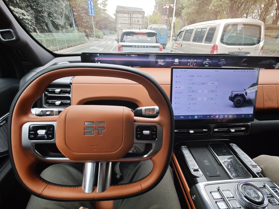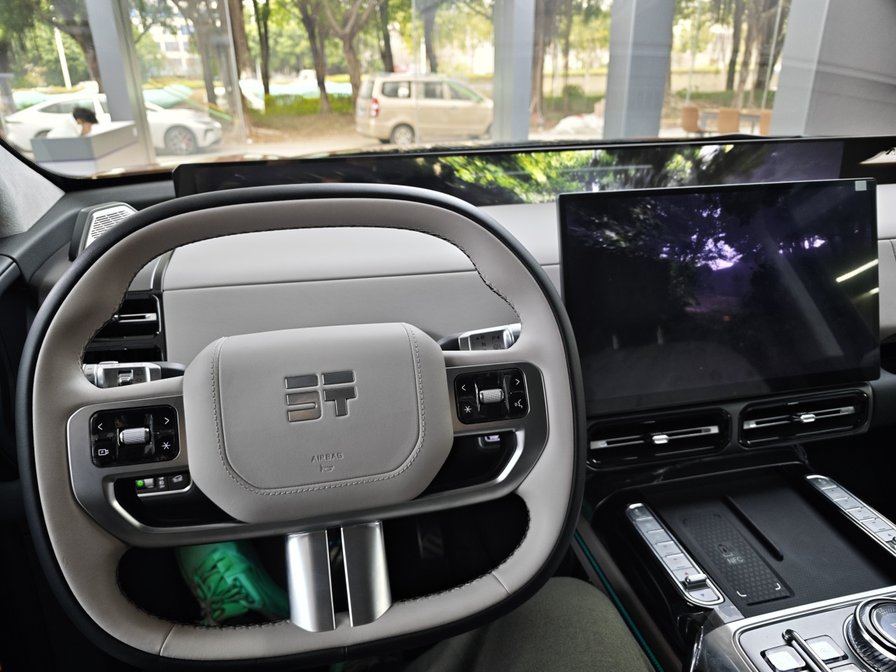 不过,作为一台尺寸不小的越野车,它的体量感是你一定要适应的。它有2.05m的车宽和厚厚的车头,所以在拐窄路、过闸机等情况下很需要依赖全景影像。好在,它的全景影像是通过方向盘实体按键开启的,清晰度也很高——这台车真的不能没有一套好的全景影像。