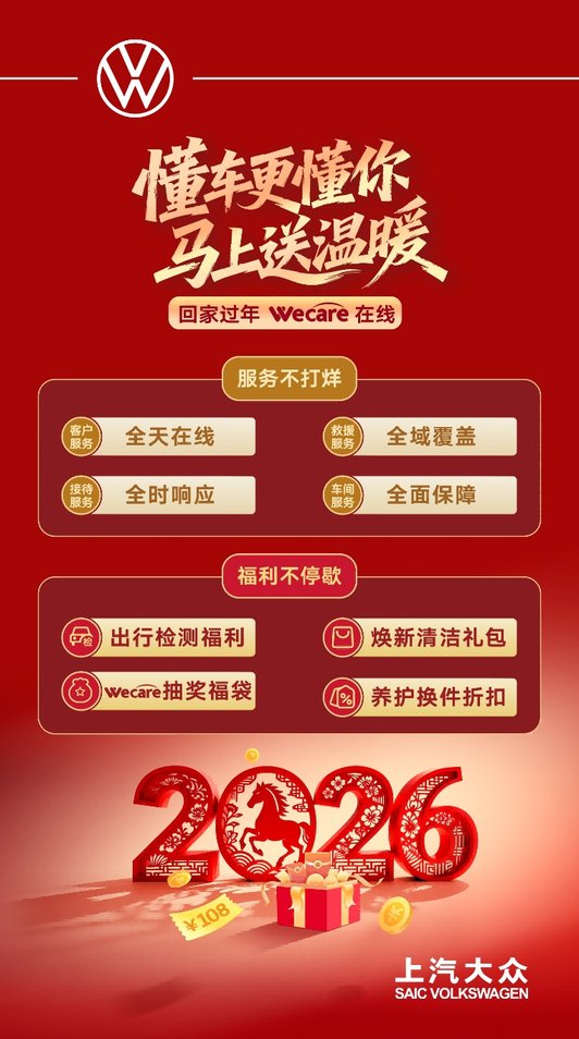 春节期间,上汽大众服务不打烊。全国经销商网络、24小时客服热线与道路救援持续值守,以“WeCare关注车·更关爱你”的服务理念,守护每一程团圆路。即日起至3月31日,还有春节出行检测、焕新清洁礼包等限时福利,赶紧向家门口的经销商门店咨询吧!