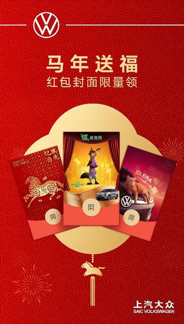 为增添节日氛围,上汽大众大众品牌精心打造多款限量版红包封面,融入马年元素、新春寄语,更有迪士尼明星IP《疯狂动物城2》联名红包封面,通过创意互动传递节日祝福,年味直接拉满。