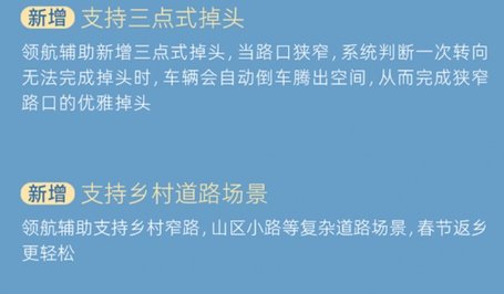 面对日常通勤与长途出行中可能遇到的复杂路况,本次升级新增多项NCA领航辅助功能,让智能辅助驾驶更聪明、更贴合中国道路实际需求。在空间受限的路口或狭窄道路,当系统判断一次转向无法安全通过时,将自动倒车腾出安全距离,通过微调车身位置完成流畅转向,真正实现“窄路不慌、小巷无忧”。