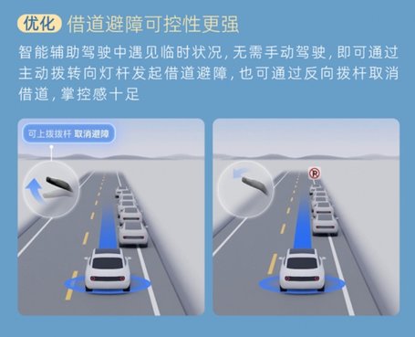 智能辅助驾驶状态下,若遇到临时施工、违停占道等突发障碍,优化后的“借道避障”功能更具可控性,用户拨动转向灯杆即可发起安全借道超车,反向拨杆即时取消,操作直观、响应迅速,让驾驶者始终掌握行车主动权。