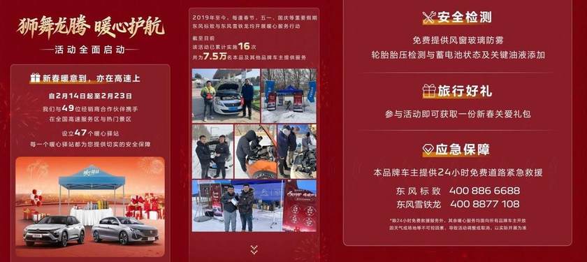 流量曝光仅是第一步,东风标致与东风雪铁龙还同步推出了一系列线下服务活动。首先是“春节高速关爱”服务:2月14日至23日,联动49家经销商,在重点高速服务区及热门景区设立47处“暖心驿站”,面向所有品牌车主提供免费安全检测、关键油液添加、新春礼包等贴心服务,本品牌车主更可尊享24小时道路救援保障。