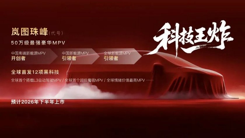 珠峰同样是代号,它将是岚图第二款MPV,并且是全新旗舰级定位,预计2026年下半年上市,价格预计达到50万级。