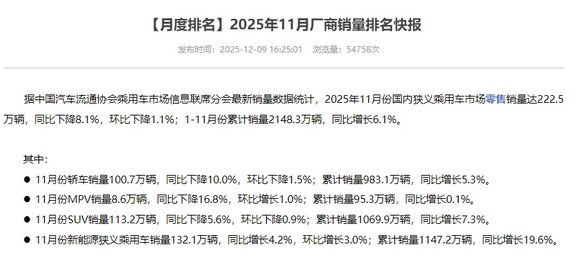 而在近些年,中国品牌在新能能源赛道,占据着绝对的主导地位,在中国市场,约7-8成的新能源市场份额由自主品牌把控,同时根据乘联会公布的数据显示,在2025年1-11月,中国狭义乘用车累计销量2148.3万辆,同比增长6.1% ,其中新能源汽车累计销量1147.2万辆,同比增长19.6%。