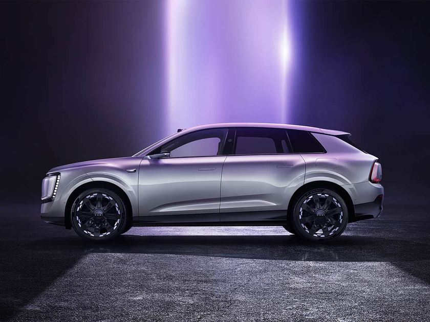 侧面的看点也很多,首先它的车顶线条并不夸张,这就保证了新车的Y轴空间表现,显然家用、空间将会是它的卖点之一。另外,新车还配备了电子后视镜,但根据申报信息猜测,这个应该是选装配置。车顶还有激光雷达,辅助驾驶值得期待。轮胎的看点也很多,它配备了8条辐样式的轮圈,结合工信部信息看应该是22英寸,另外还有三种设计和21英寸规格可选。