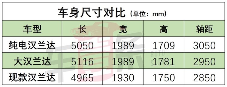 尺寸方面,新车长宽高分别为5050*1989*1709mm,轴距3050mm。这个体量已经非常接近2023年在海外推出的大汉兰达(5116*1989*1781mm,轴距2950mm),轴距甚至更长。