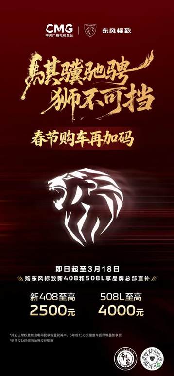 春节的脚步越来越近,东风标致为广大消费者送上一份诚意满满的购车年礼。即日起至3月18日,东风标致开启限时购车补贴政策,覆盖“法式六边形战士”新408与驾控旗舰508L两款核心车型,补贴金额至高4000元。岁末年初购车正当时,品牌直补、真金白银,东风标致以满满诚意,让更多消费者轻松开启法式品质生活的新旅程。