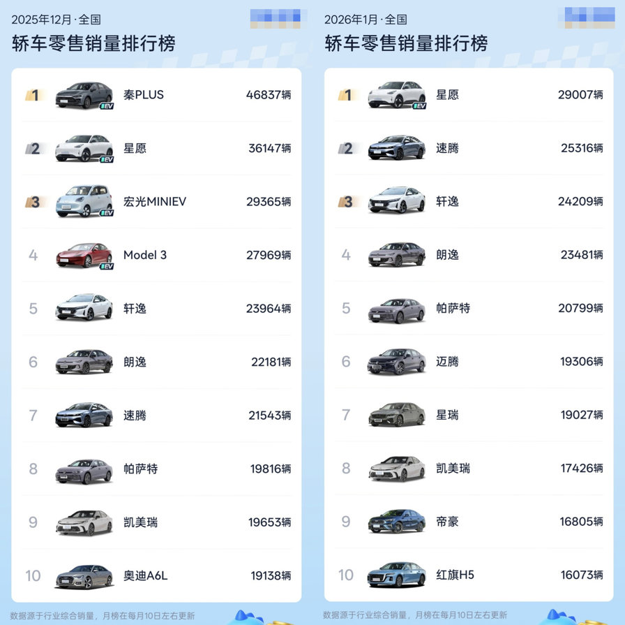 1月轿车市场彻底洗牌,主要表现为新能源车型集体溃败,传统燃油车强势逆袭、重回市场主导。比如,2025年12月榜单中的秦PLUS、宏光MINIEV、Model 3等车型悉数退出前十,新能源轿车市场结构迎来明显切换。